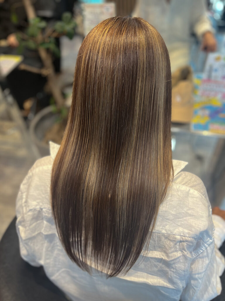 白髪を「隠す」から「活かす」へ。細かく入れたハイライトで白髪をなじませながら、全体を自然にトーンアップ。ブラウ …
